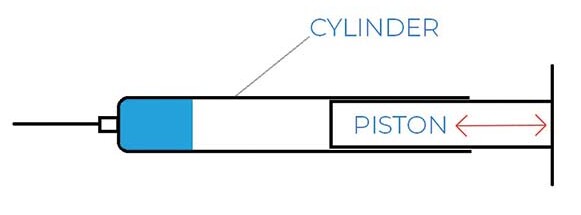 向后拉注射器的活塞會產生吸力,將液體拉入氣缸,同時向前推動活塞將液體通過注射器的推頭排出(圖 1)。