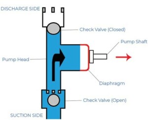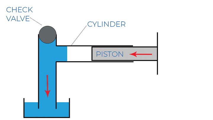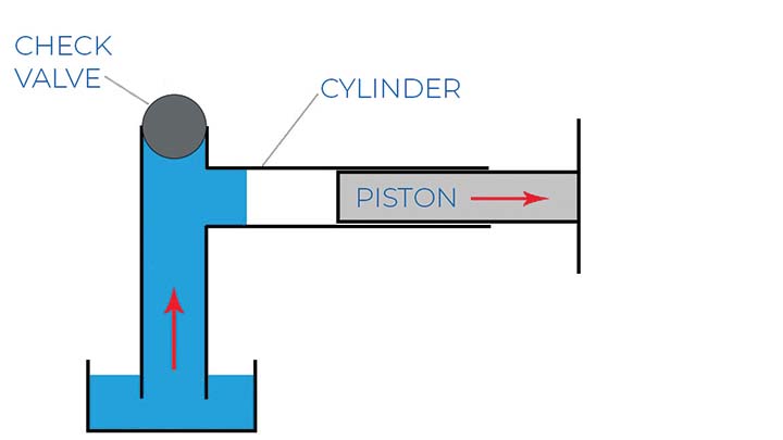 以同樣的方式,泵中的隔膜向泵體內和向外移動,與止回閥一起工作以吸入和排出泵中的流體。下面的圖 2 顯示,如果沒有止回閥,當活塞向外移動時,空氣會簡單地流入氣缸,從而阻止任何吸入。